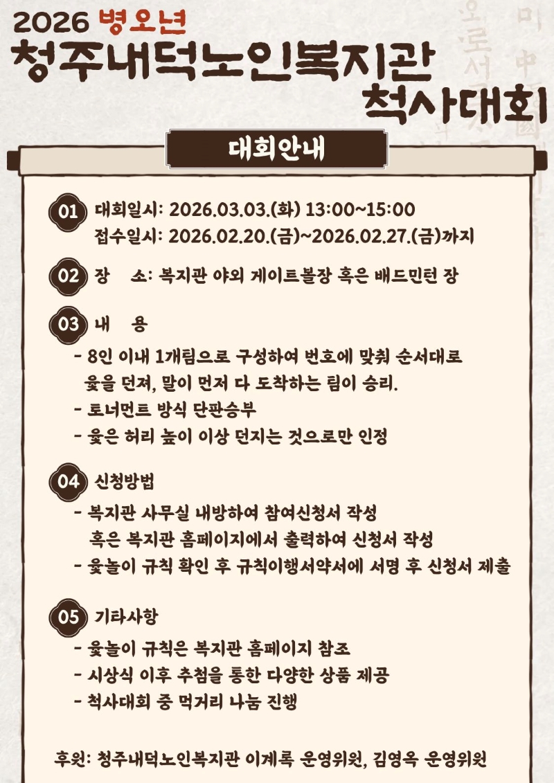 청주내덕노인복지관에서는 2026년 병오년(丙午年) 정월대보름을 맞이하여, 잊혀가는 세시풍속의 의미를 되새기고 지역사회와 함께 정(情)을 나누는 "어울~렁! 더울~렁!" 정월대보름 나눔행사를 진행합니다.