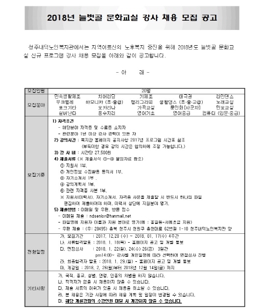 | [공고] 2018년 늘벗골 문화교실 평생교육 취미여가지원사업 강사 공개채용 모집 공고 | |||