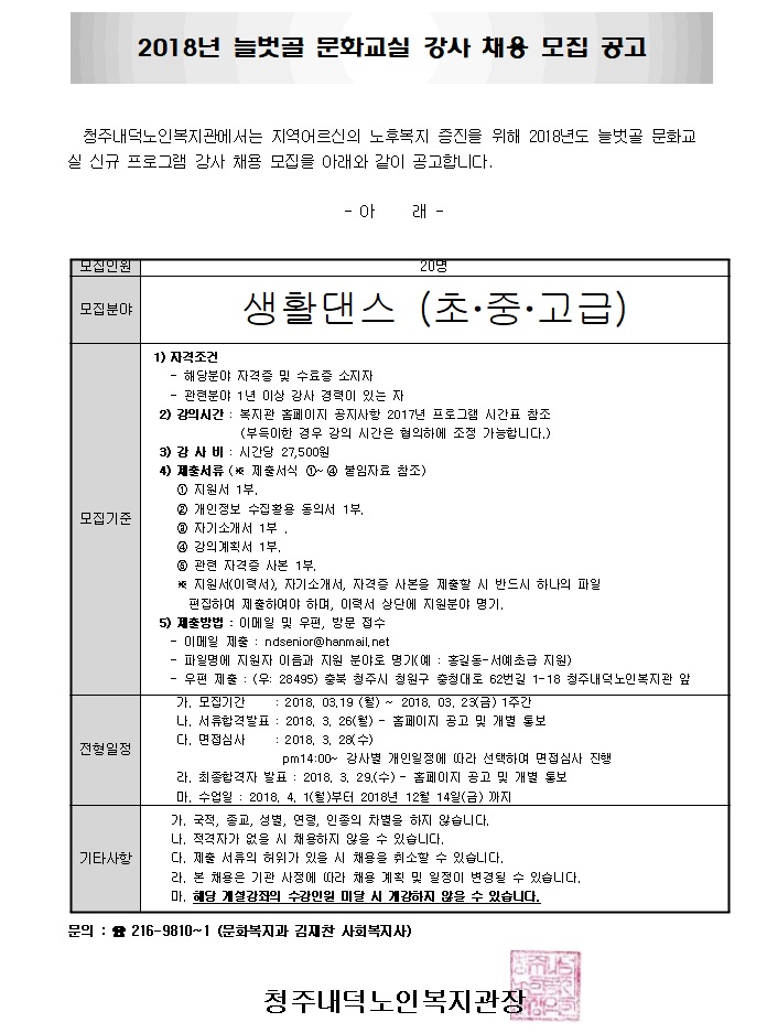 | [긴급] 2018년 늘벗골 문화교실 평생교육 취미여가지원사업 생활댄스 강사 공개채용 모집 공고 | |||