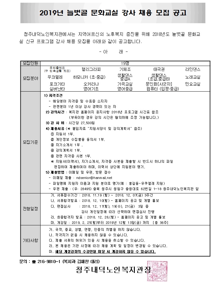 | 2019년 늘벗골 문화교실 강사 공개모집 | |||