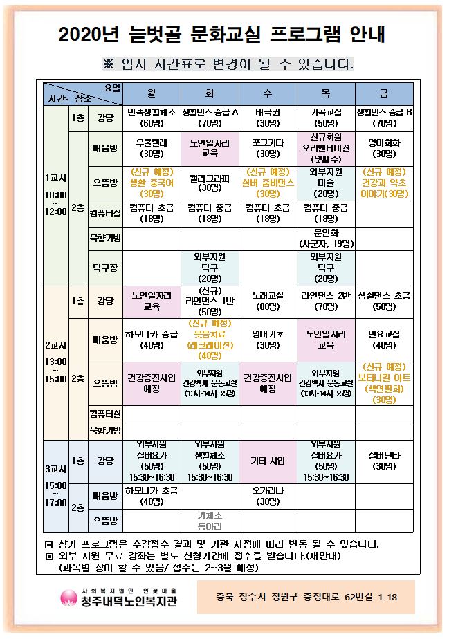 2020 늘벗골 문화교실 임시 시간표 입니다. 상기 일정은 복지관 사정 및 강사 일정으로 변동 될 수 있습니다. 청주시에 거주하는 60세 이상 어르신들의 많은 관심과 참여 바랍니다.