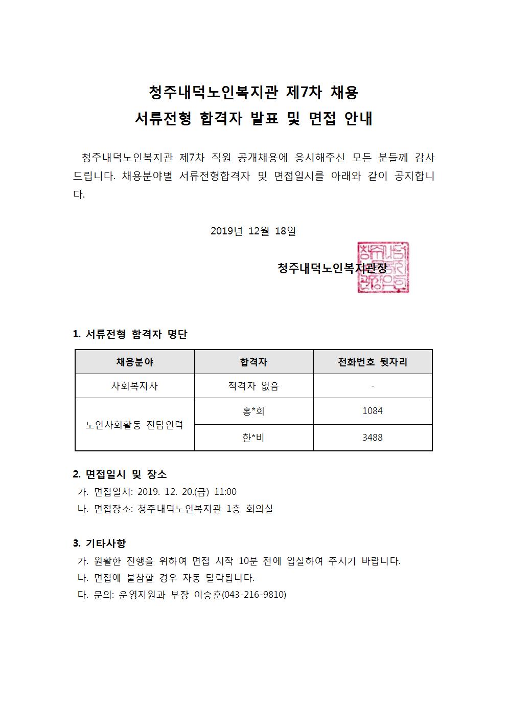 | 청주내덕노인복지관 제7차 직원채용 서류합격자 공고 | |||