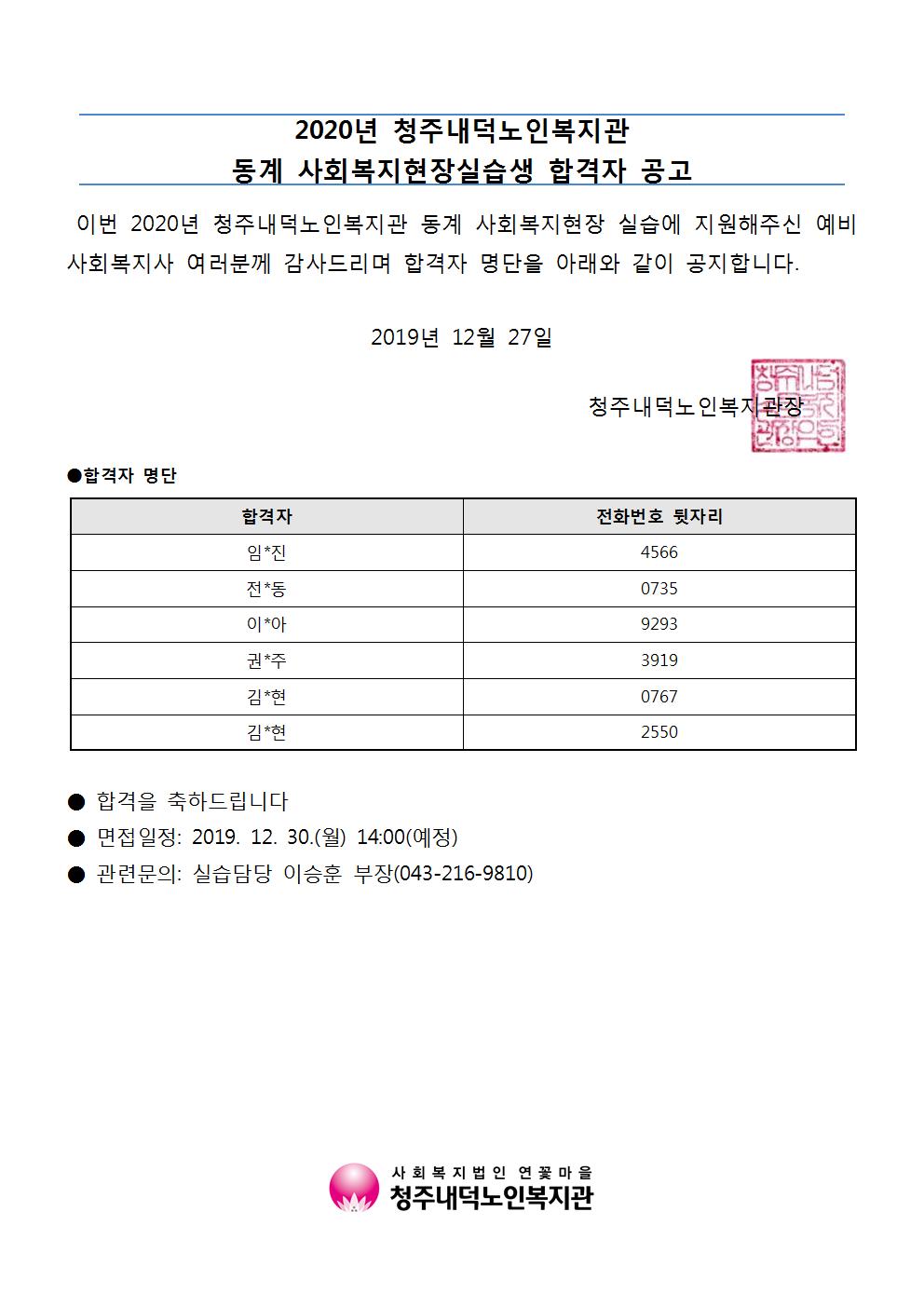 | 2020년 동계 사회복지현장실습생 합격자 공고 | |||