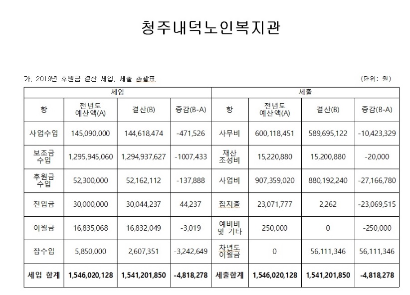 2019년도 청주내덕노인복지관 세입 세출 결산 공고