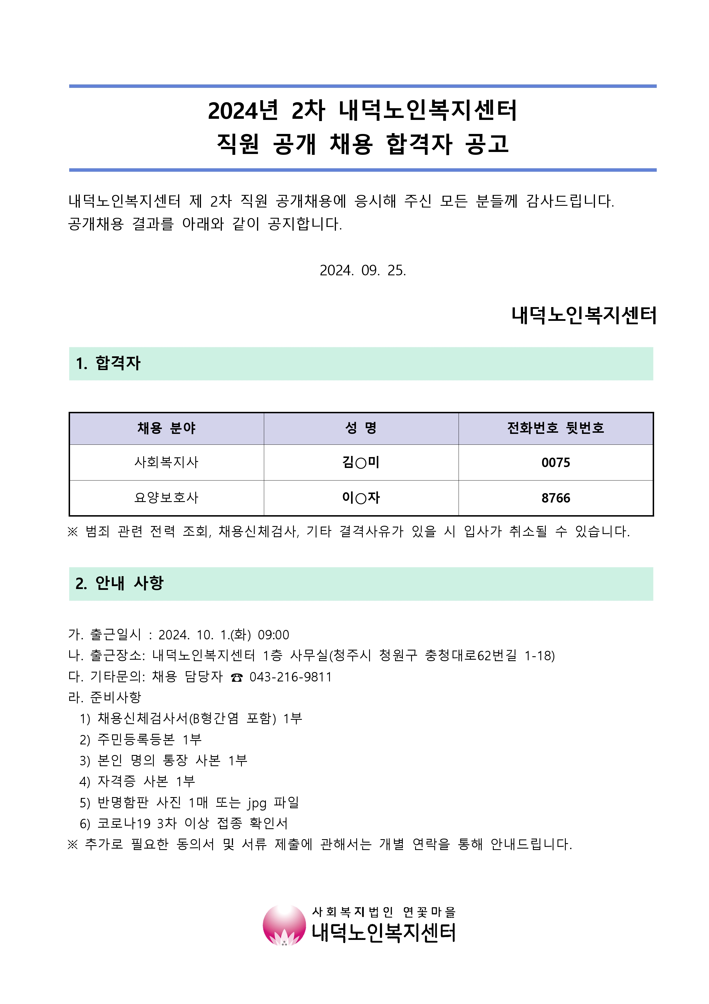 | 2024년 2차 내덕노인복지센터 직원(사회복지사 및 요양보호사) 채용 최종 합격자 공고 | |||