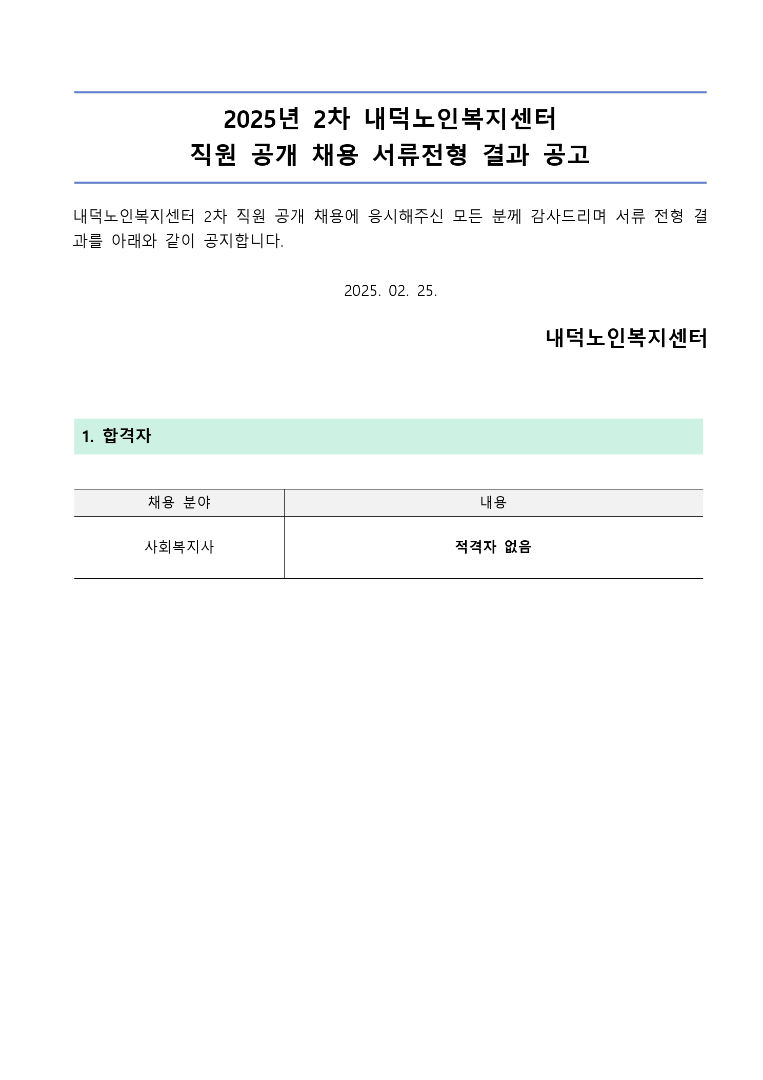 | 2025년 2차 내덕노인복지센터 직원 공개채용 서류 전형 결과 발표 | |||