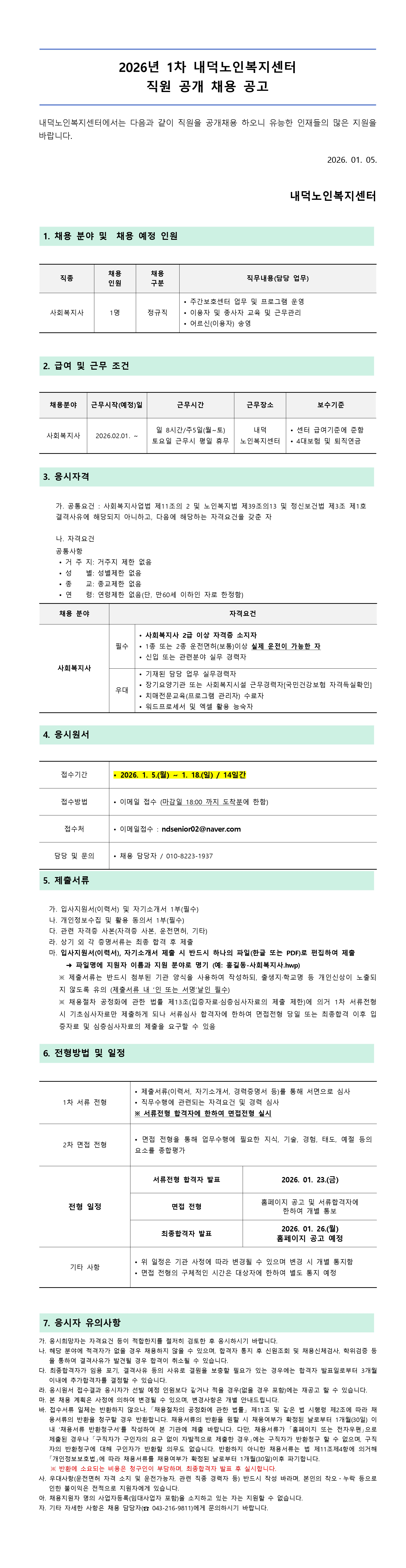| 2026년 1차 내덕노인복지센터 직원 채용 공고 | |||