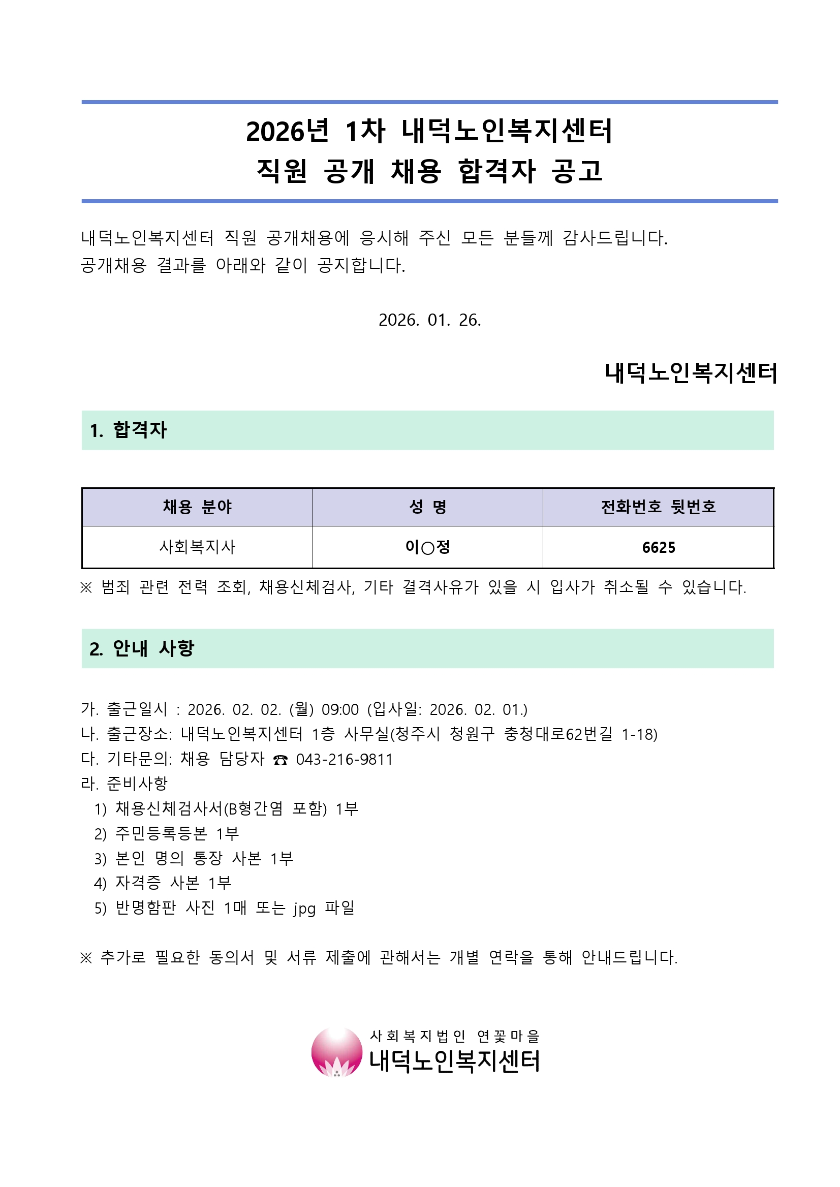 2026년 1차 내덕노인복지센터 직원 채용 최종 합격자 공고