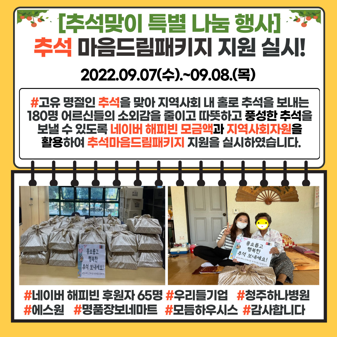 추석 마음드림패키지는 네이버 해피빈 후원자 65명, 우리들기업, 청주하나병원, 에스원, 명품장보네마트, 모듬하우시스 등 지역업체의 마음을 모아 구성하였습니다. 코로나19로 힘든 상황 속에서 지역업체의 나눔을 통해 어르신들께서 풍성한 명절을 보낼 수 있었습니다.