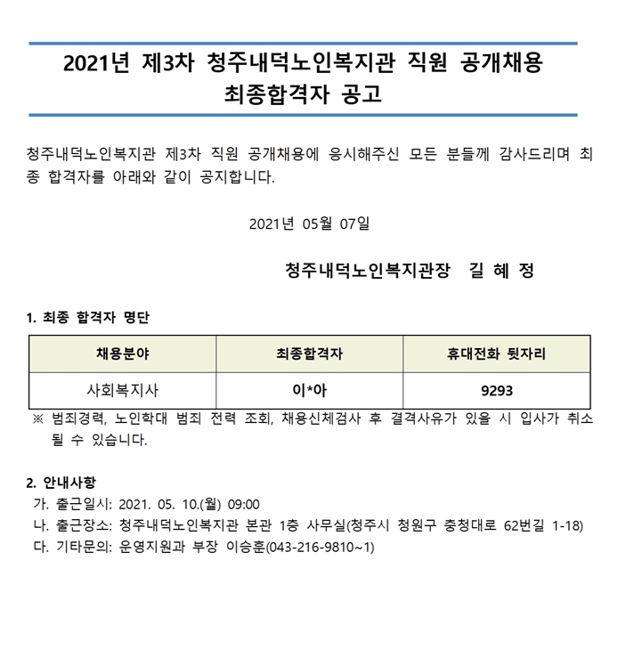 2021년 제3차 직원 공개채용 최종 합격자 공고