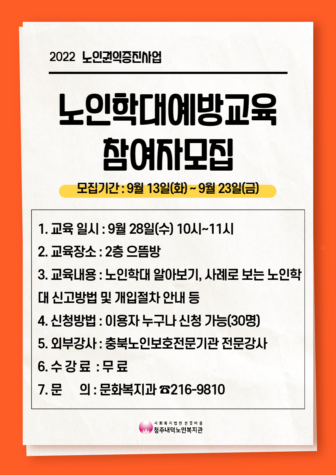 노인학대예방교육은 9월 28일(수) 10시에 진행 됩니다. 이에 교육에 참여할 참여자를 9월 23일(금)까지 모집하오니 많은 관심과 참여 바랍니다