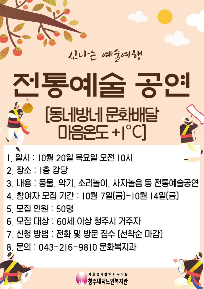 10월 7일(금) ~ 10월 14일(금) 기간 동안 전통예술공연 참여자 모집을 합니다.