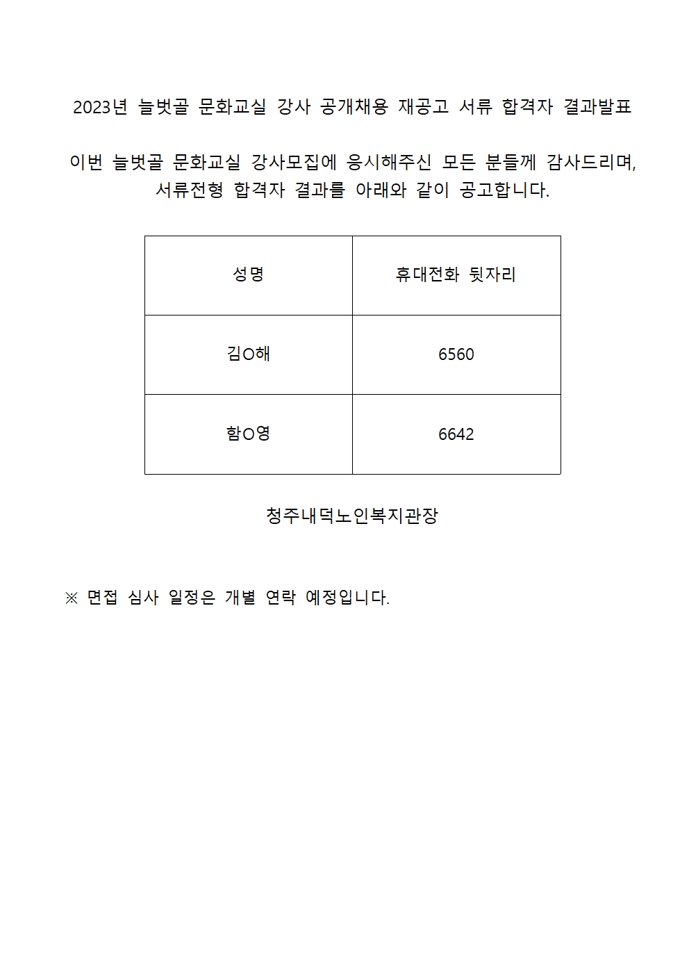 2023년 늘벗골 문화교실 강사채용 재공고 서류합격자 발표