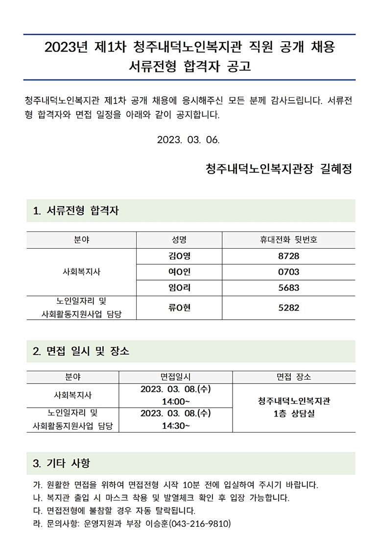 2023년 제1차 직원 공개채용 서류전형 합격자 및 면접 안내
