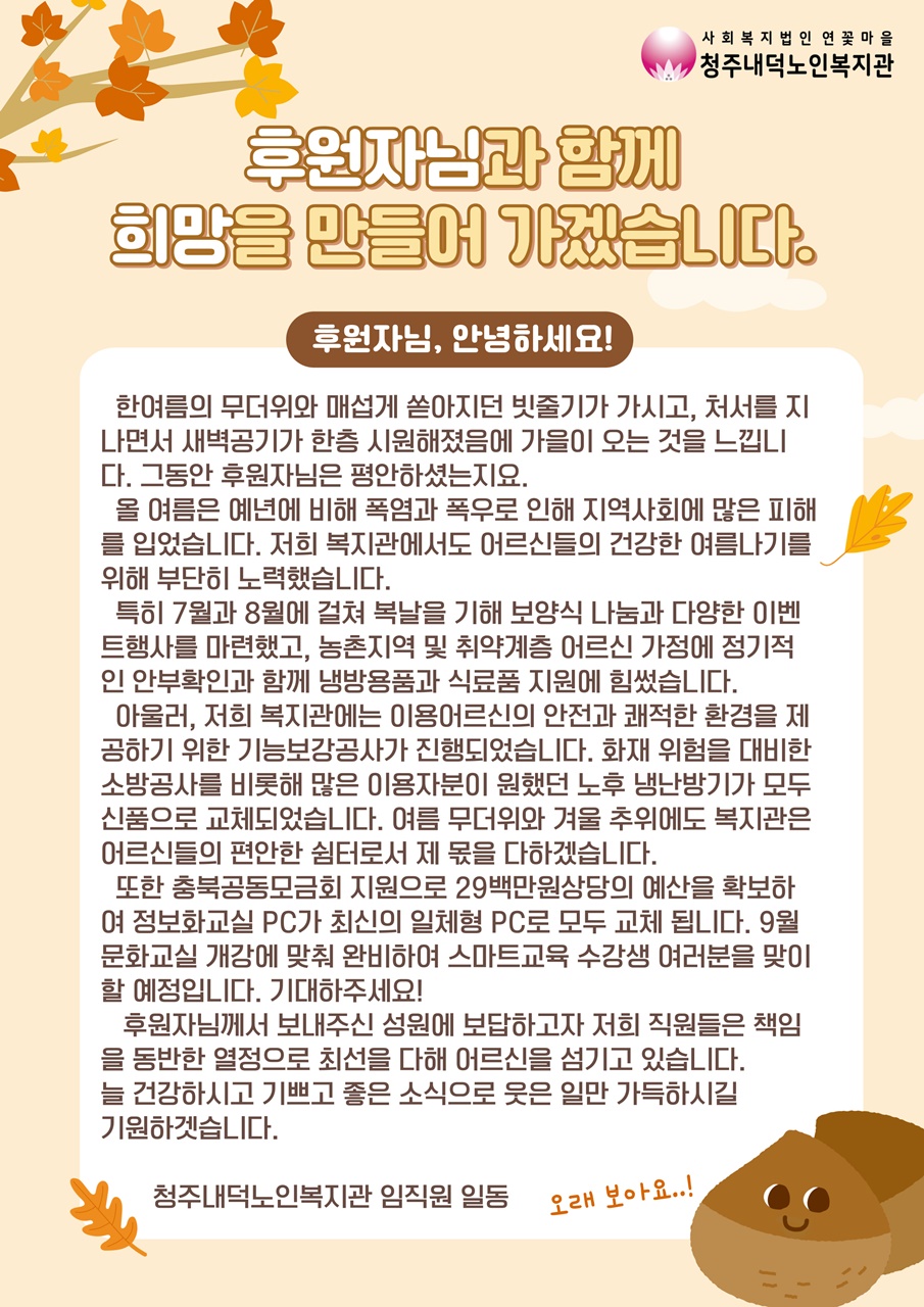 청주내덕노인복지관은 소통과 나눔, 공감이 어우러지는 어르신들의 편안한 쉼터이자 행복 나눔 공간을 의미합니다.