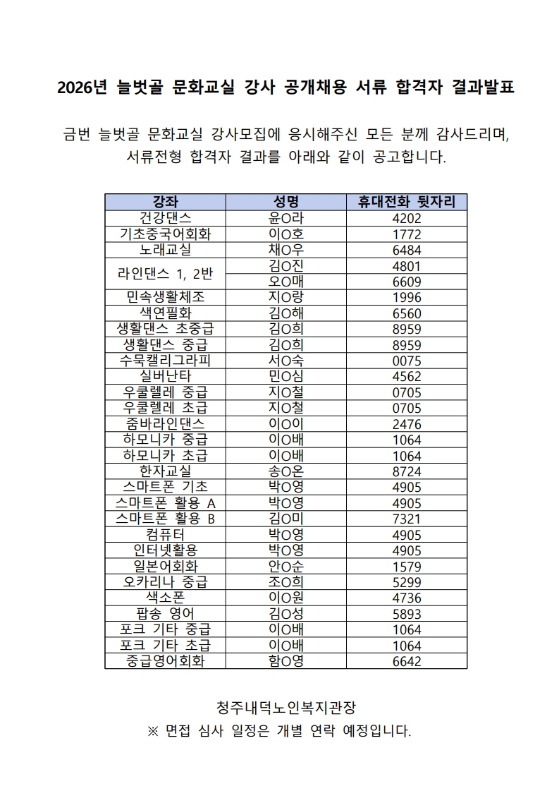 2026년 늘벗골 문화교실 강사 공개채용 서류 합격자 결과 발표